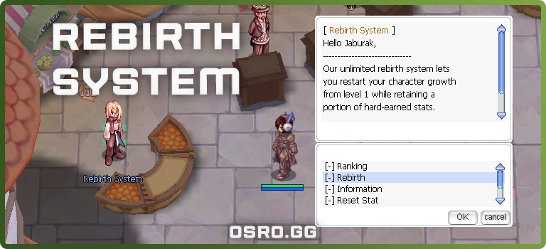 <figure><img src="https://817602011-files.gitbook.io/~/files/v0/b/gitbook-x-prod.appspot.com/o/spaces%2FtDQ5TRHZ41hnR3iUjBpZ%2Fuploads%2FKhdyBUPvodO4m9lNhgDJ%2Frebirth.png?alt=media&#x26;token=669ee91d-1a4d-447f-b386-72ba06b7dbb6" alt=""><figcaption><p>@warp prontera 138 176</p></figcaption></figure>